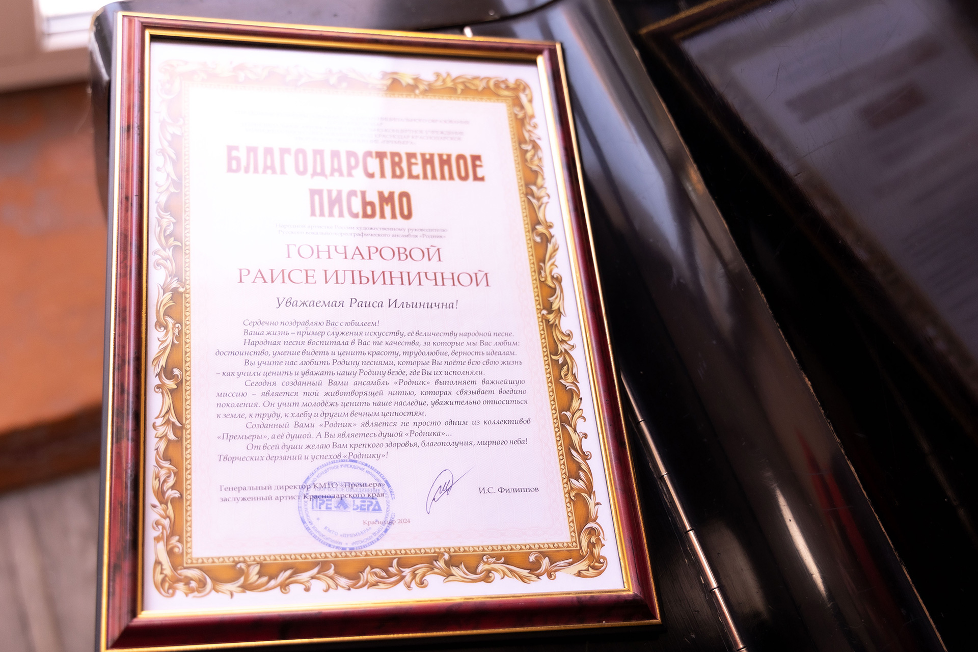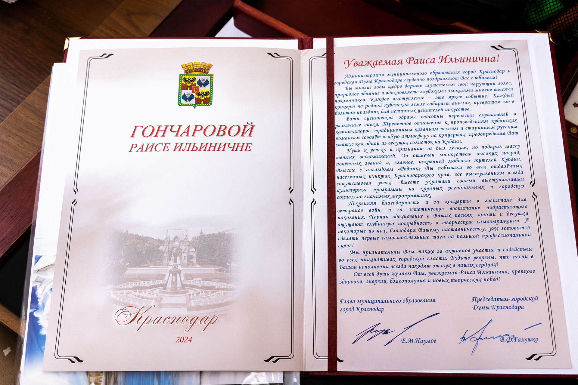 От лица мэра Краснодара Евгения Наумова и начальника управления культуры Краснодара Ирины Удовицкой Раису Гончарову поздравила первый заместитель начальника управления культуры города Инна Артемова.