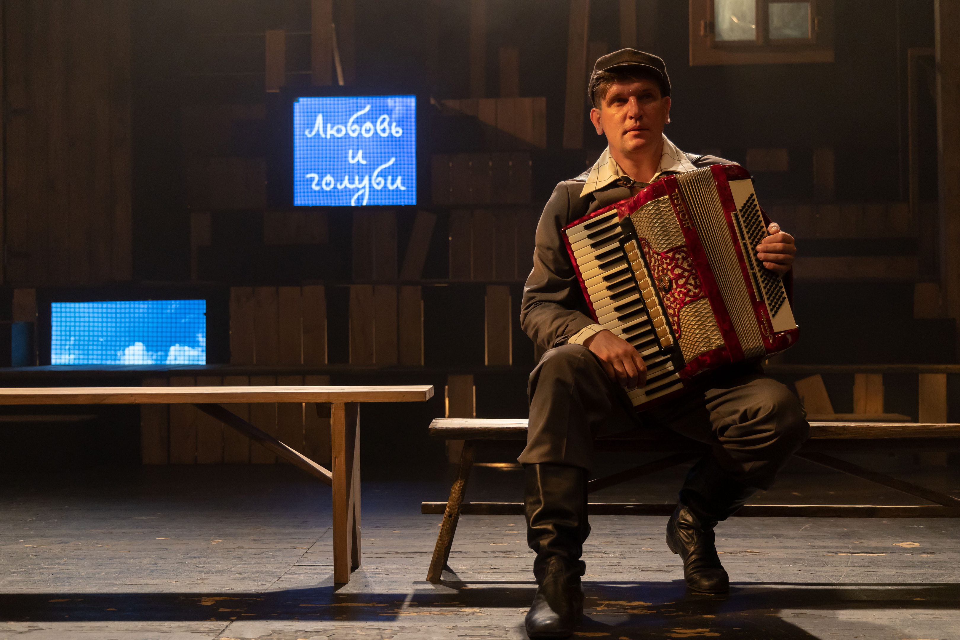 Ещё один персонаж – придуманный режиссёром деревенский гармонист Ян Новиков. Камертон спектакля. Такой душевный камертон!
