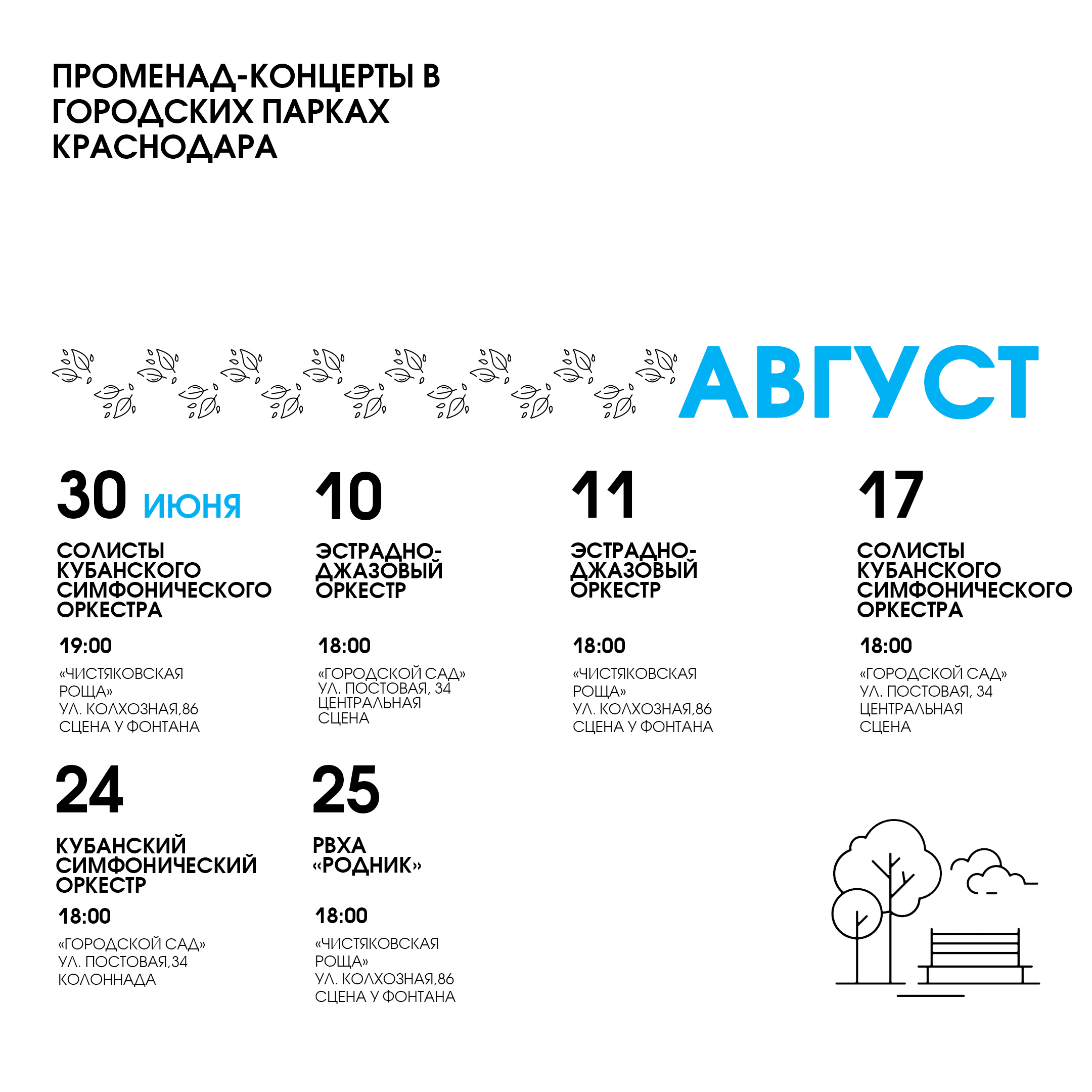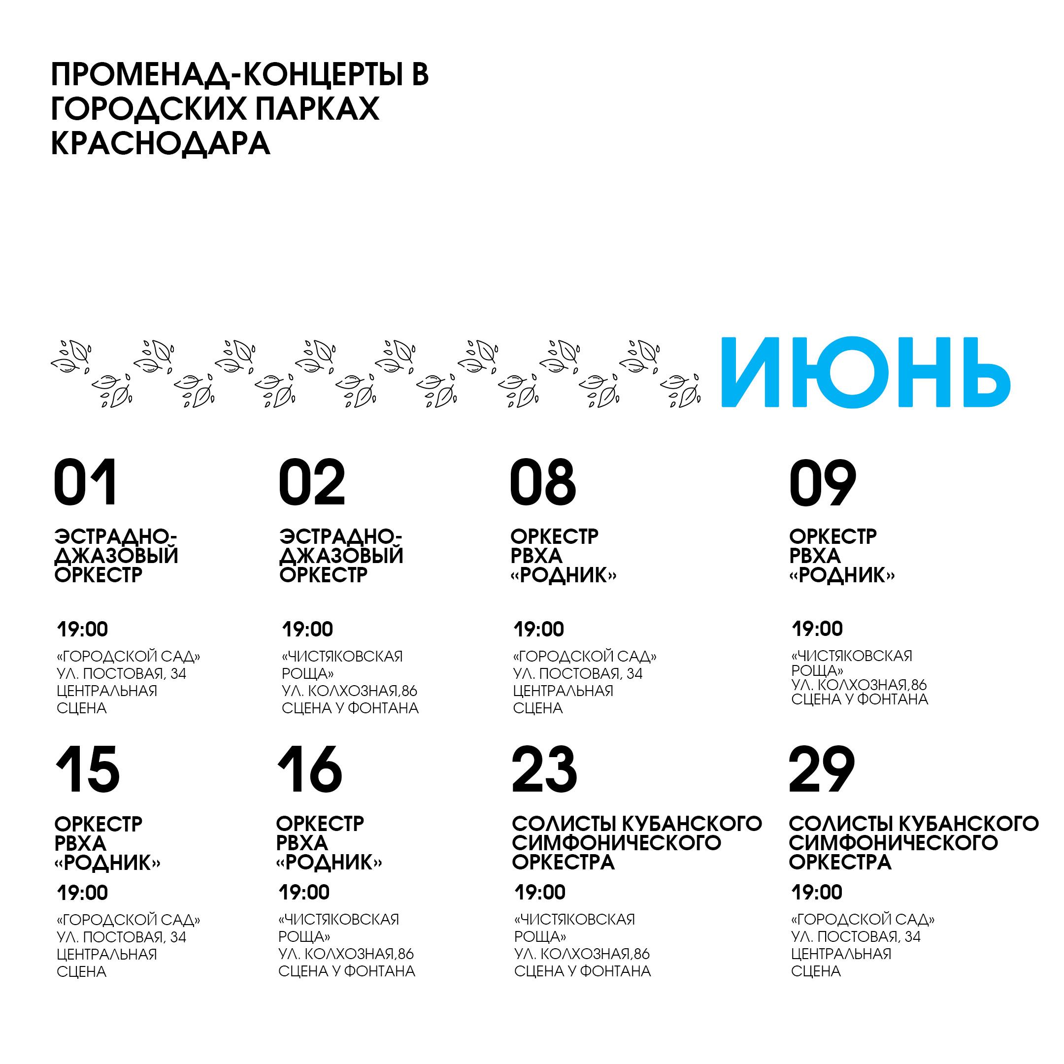 Этим летом жанровый ассортимент оркестров расширится. На традиционных площадках в Городском саду и в Чистяковской роще выступят: оркестр Русского вокально-хореографического ансамбля «Родник», Эстрадно-джазовый оркестр Ильи Филиппова, солисты Кубанского симфонического оркестра. Заключительным аккордом летней музыки станет концерт Кубанского симфонического оркестра в Городском саду и концерт оркестра Русского вокально-хореографического ансамбля «Родник» в Чистяковской роще.