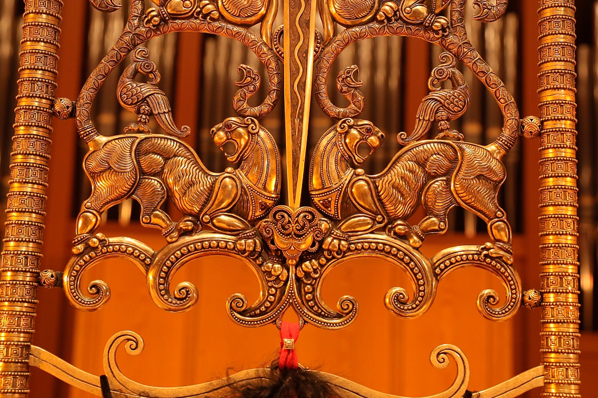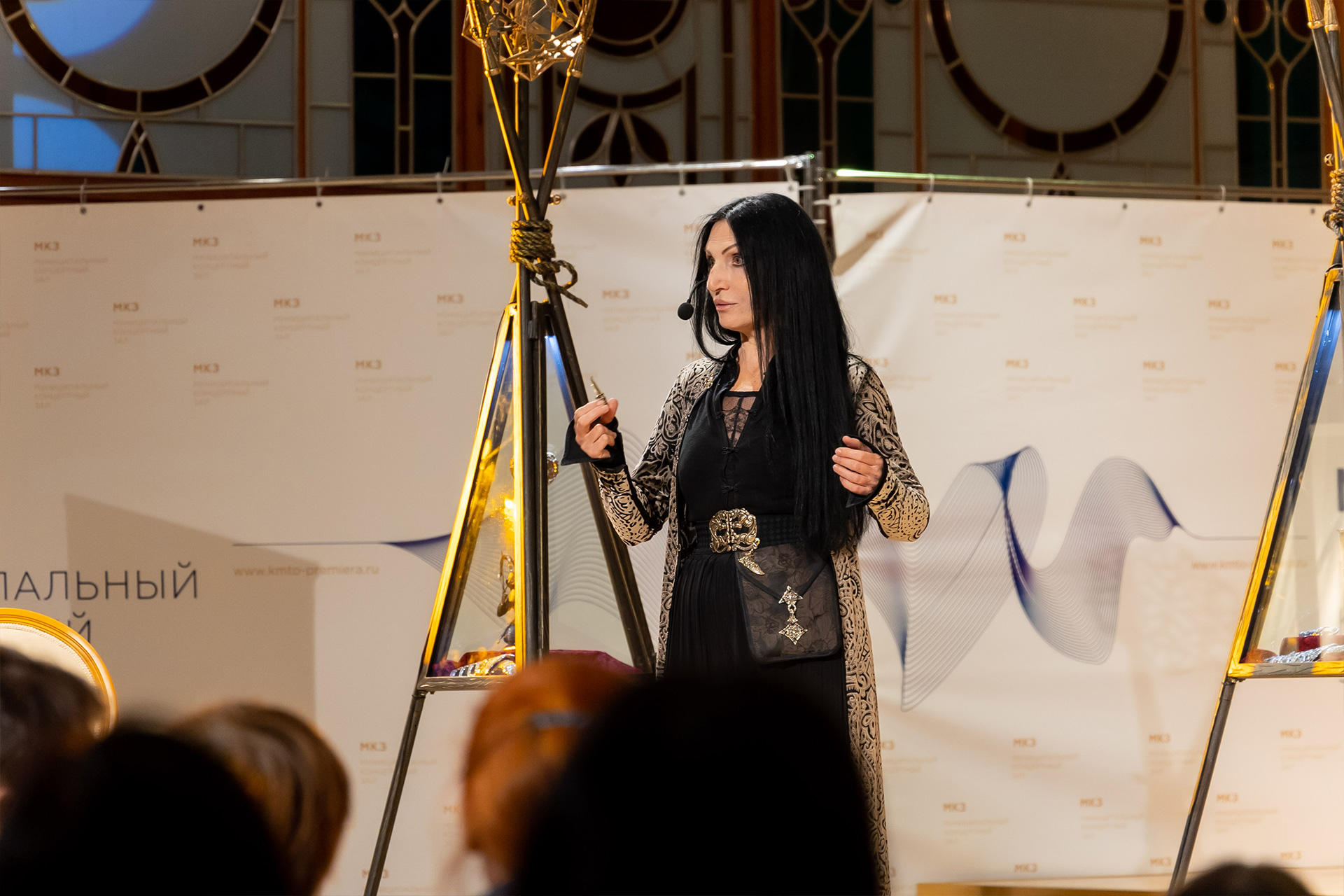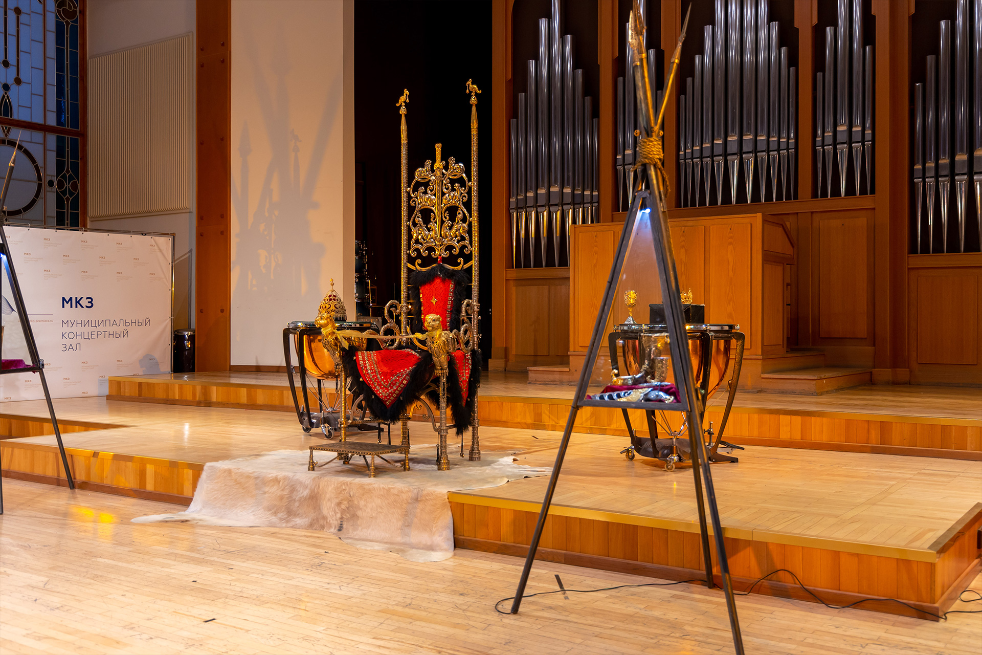 Это действительно стоило увидеть! Жемчужина Золотой кладовой – величественный Трон Царицы Амазонок из золота и бронзы, над которым художник, потомственный ювелир и оружейник, работала год. Короны, орнамент которых сплетён из античных и адыгских мифов. Фантастической красоты оружие и предметы амуниции… А как красиво всё это смотрелось на сцене органного зала! В таинственном мерцании труб органа Рудольф фон Беккерат! Кажется, король инструментов, построенный по последнему слову музыкальной науки, беззвучно выводит мелодию, вступая в диалог с тысячелетней мифологией земли адыгов!