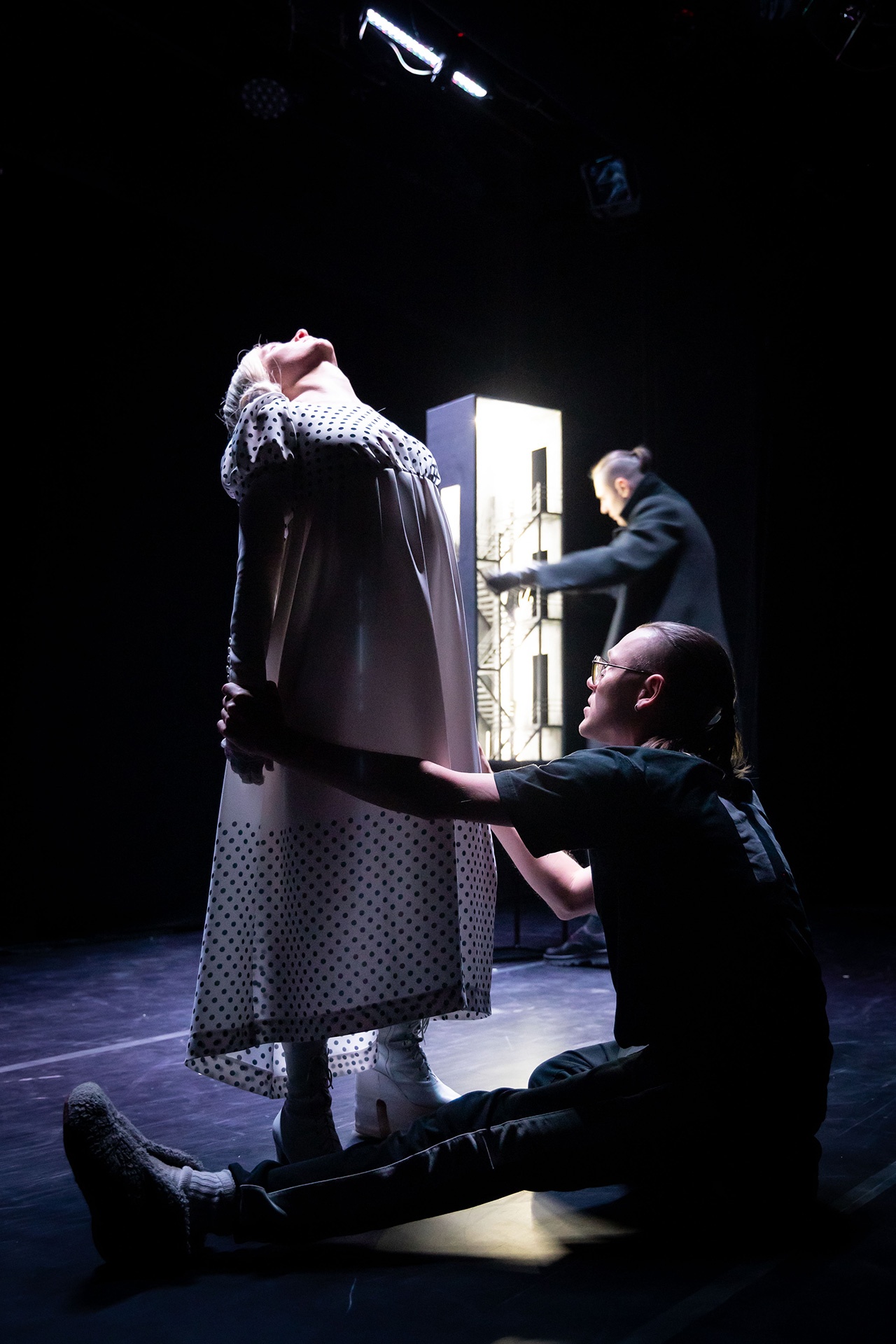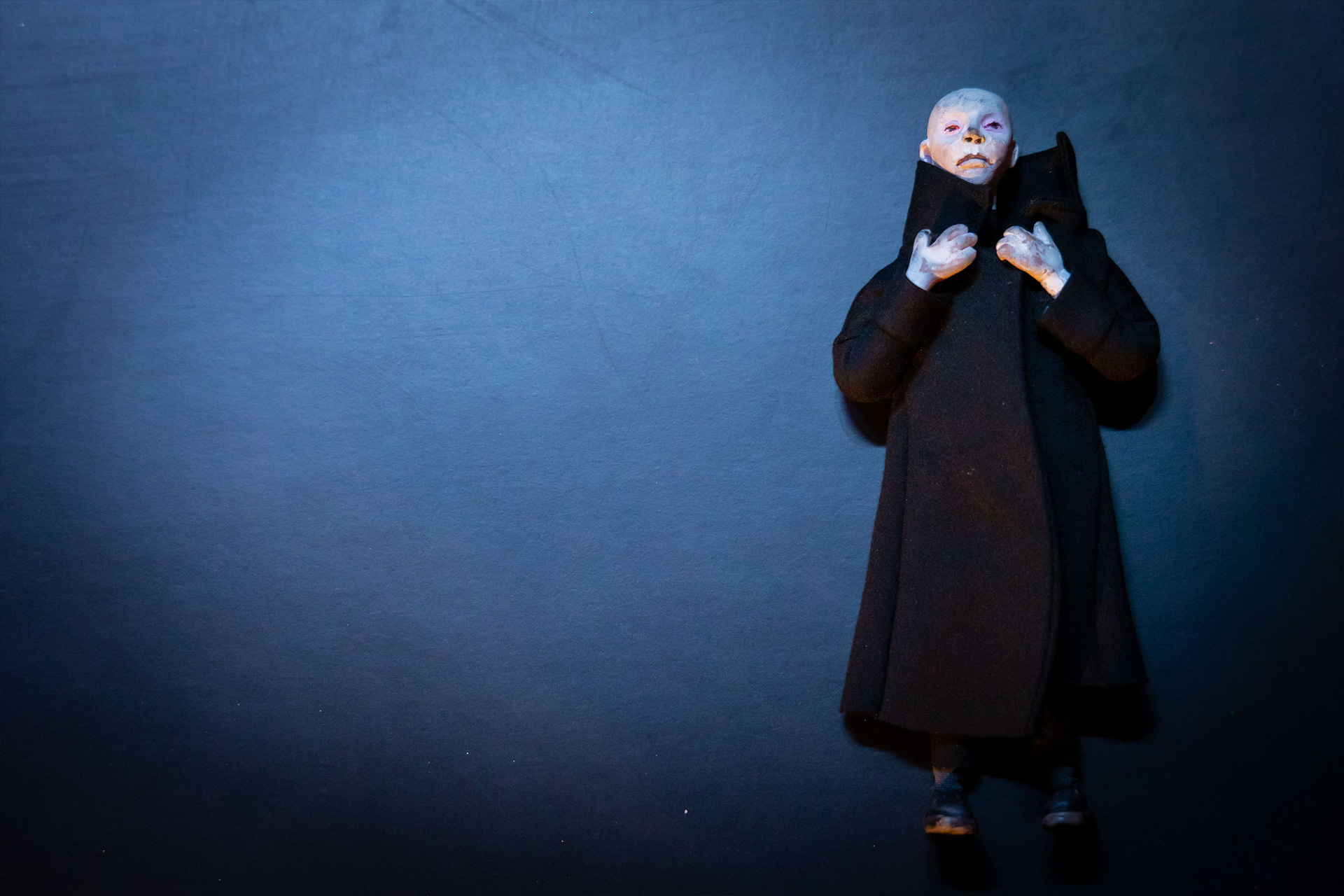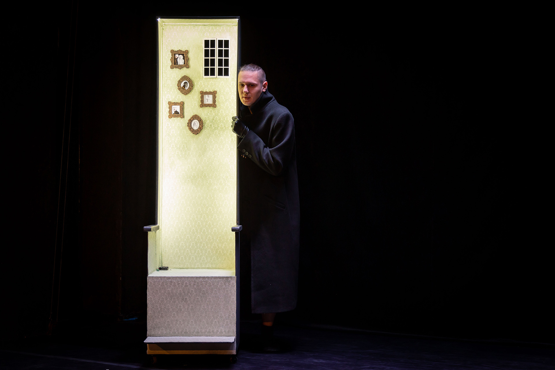 Лаконично, тревожно, атмосферно. Три слова характеризуют то, что происходит на сцене Нового театра кукол. Словно в квесте, блуждает по черно-белым улицам и мостам, коридорам и лестницам Петербурга странный чёрный человек в пальто. Он идет против своих принципов, походя ломая чужие судьбы.