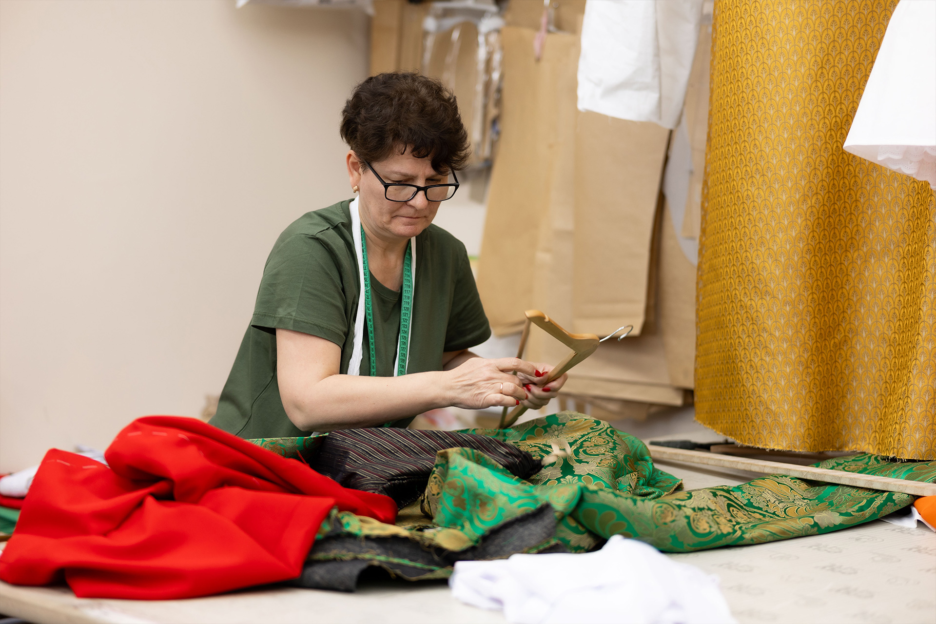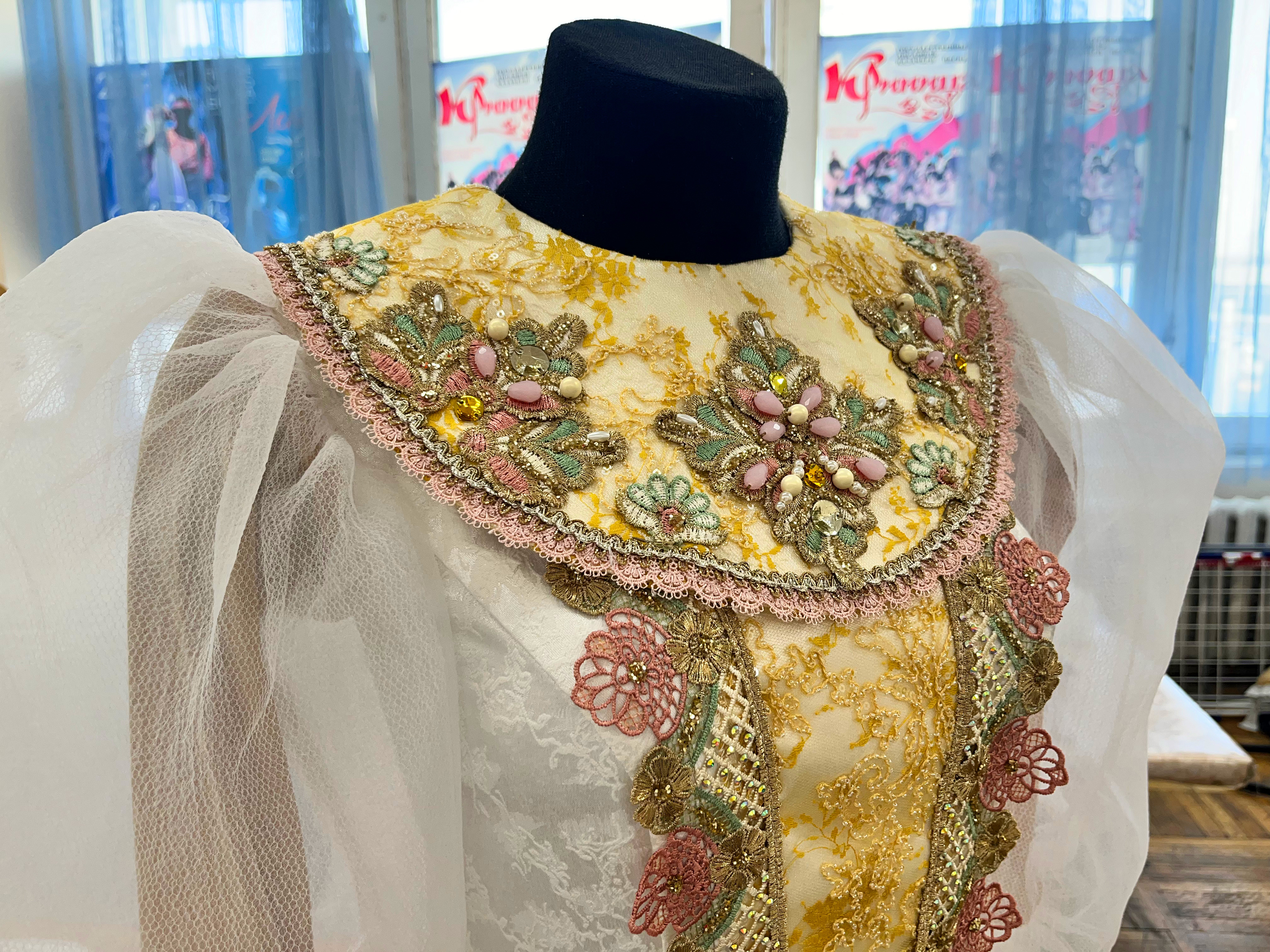 А какие шьются костюмы! Они источают особое обаяние. Все костюмы словно выросли из русского платка с его затейливыми узорами. Платья, кафтаны, рубашки украшены декоративными элементами, вырезанными из популярного во все времена головного убора.