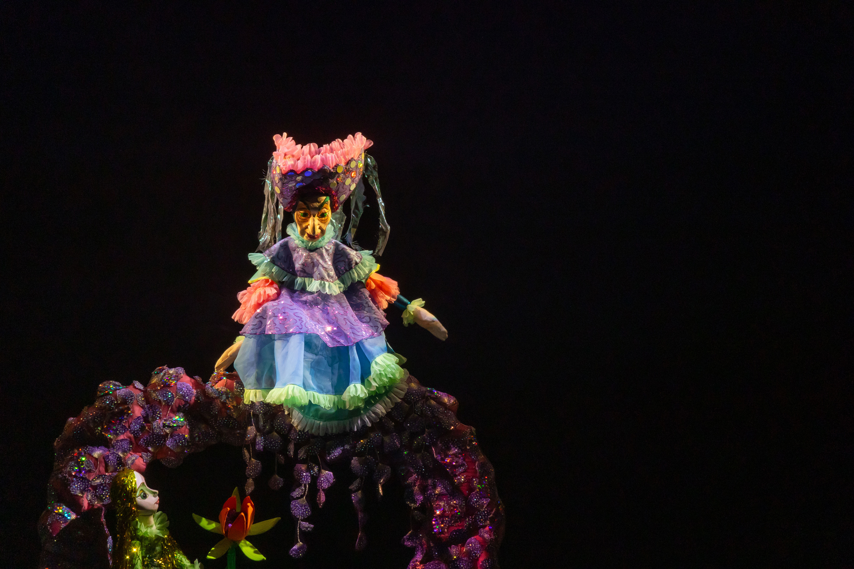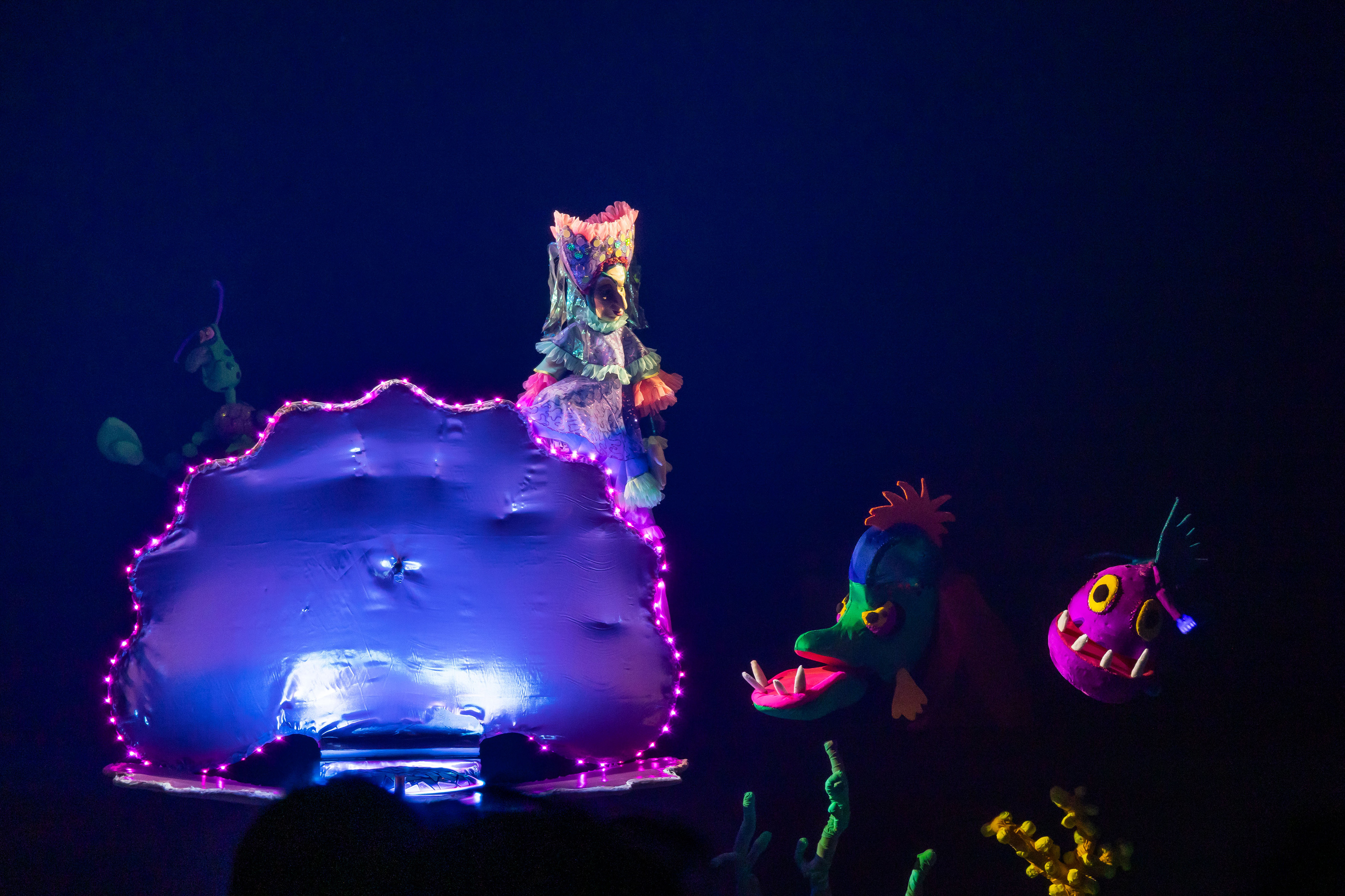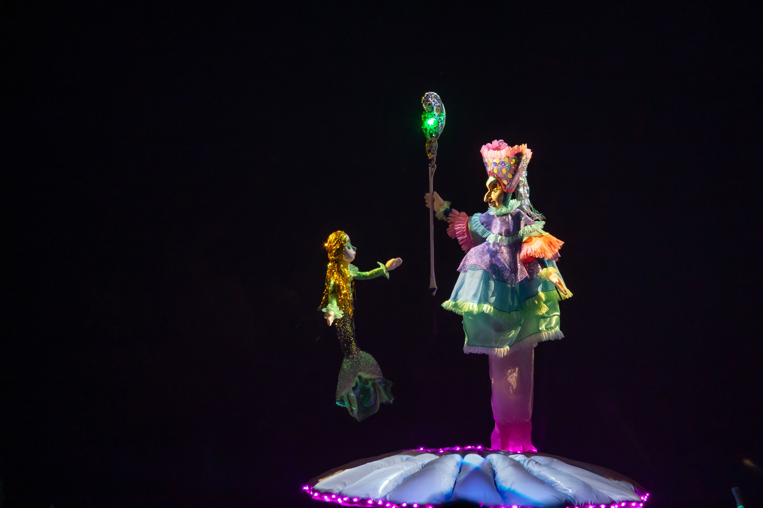 Перед нами предстали куклы: выразительные колдунья и владычица морская, придворные, разнообразные обитатели морских глубин и люди. Мы не видим артистов, но их голоса, их похожее на магию искусство делают кукол живыми…