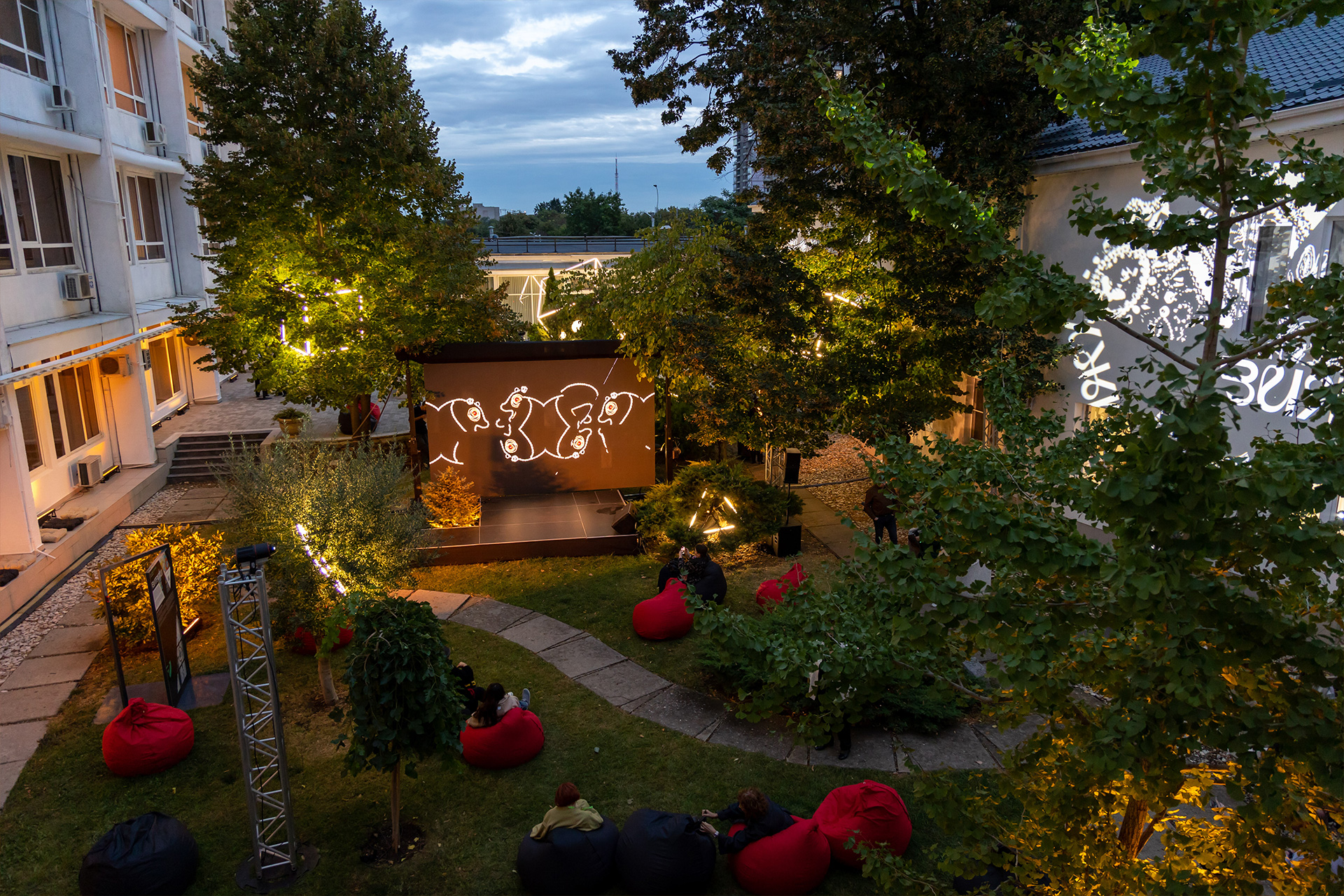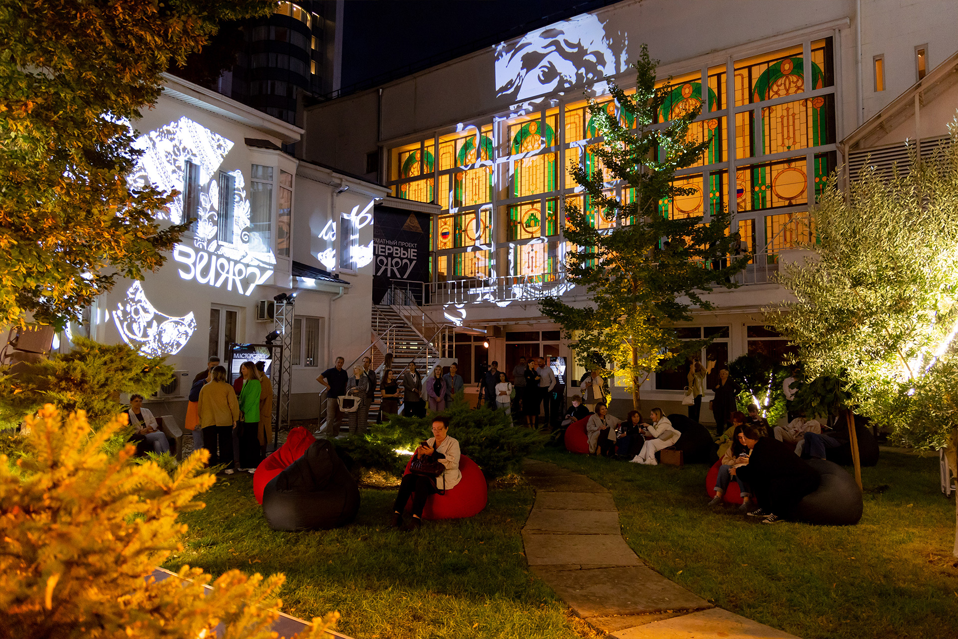 На открытии было атмосферно. Приятная музыка. Цифровые экраны. Разбросанные тут и там пуфики для зрителей. Таманский брют… Лёгкие сумерки, словно наброшенное «на плечи» дворика газовое покрывало, придавали вечеру таинственность и некую зыбкость.