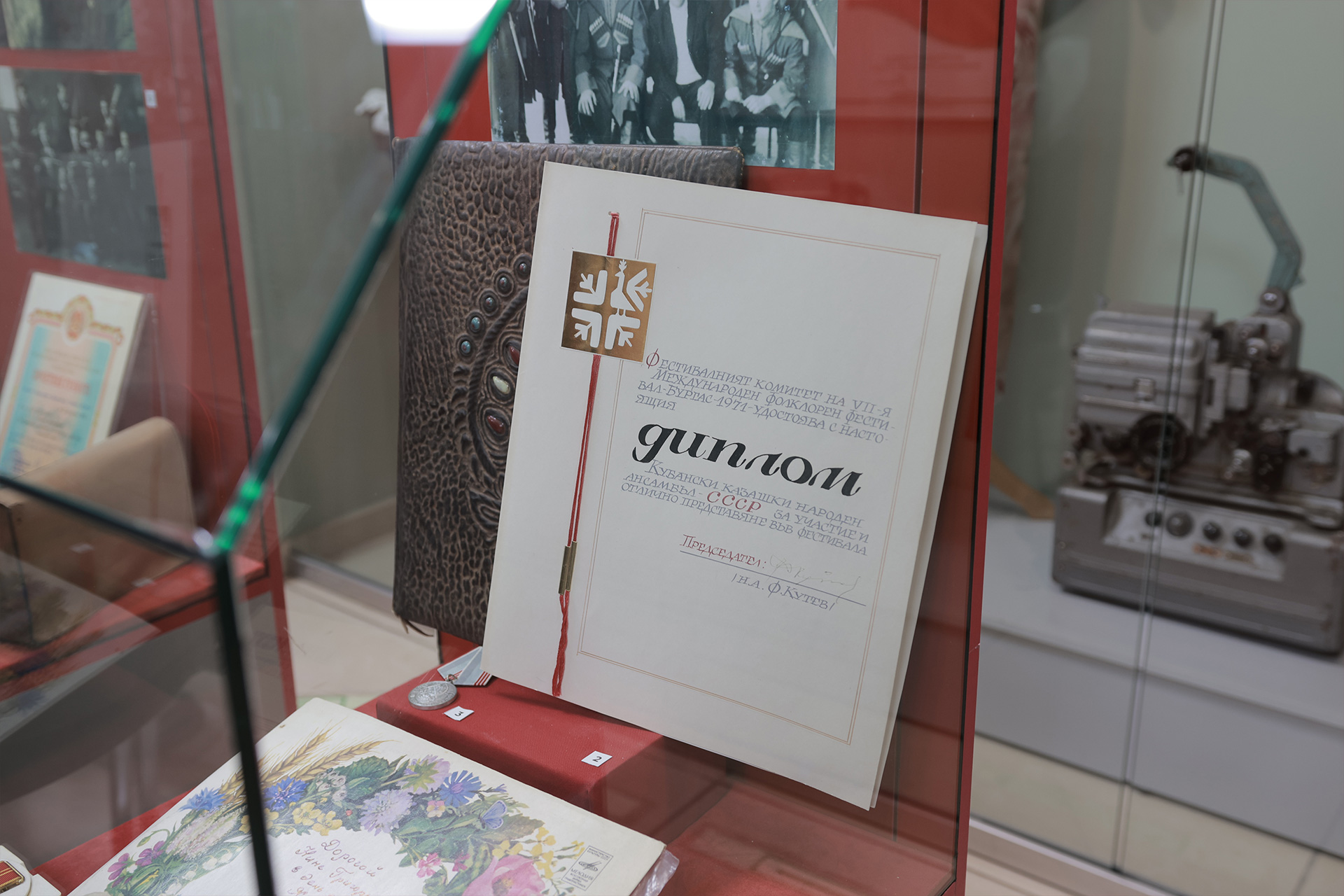 Обо всём этом рассказывают экспонаты выставки. Здесь и самодеятельность села Петровское, и трогательные семейные снимки молодого Серёжи с Александрой, матерью музыканта, сделанные в марте 1946-го перед поступлением в Ставропольское музучилище. И страничка Северного хора, и диплом Кубанского казачьего, выданный на гастролях в Бургассе. Карточка из отдела кадров музучилища с указанием заслуг и международных гастролей мастера и… личные записные книжки Сергея Алексеевича с программами его студентов и телефонами очень важных людей…
