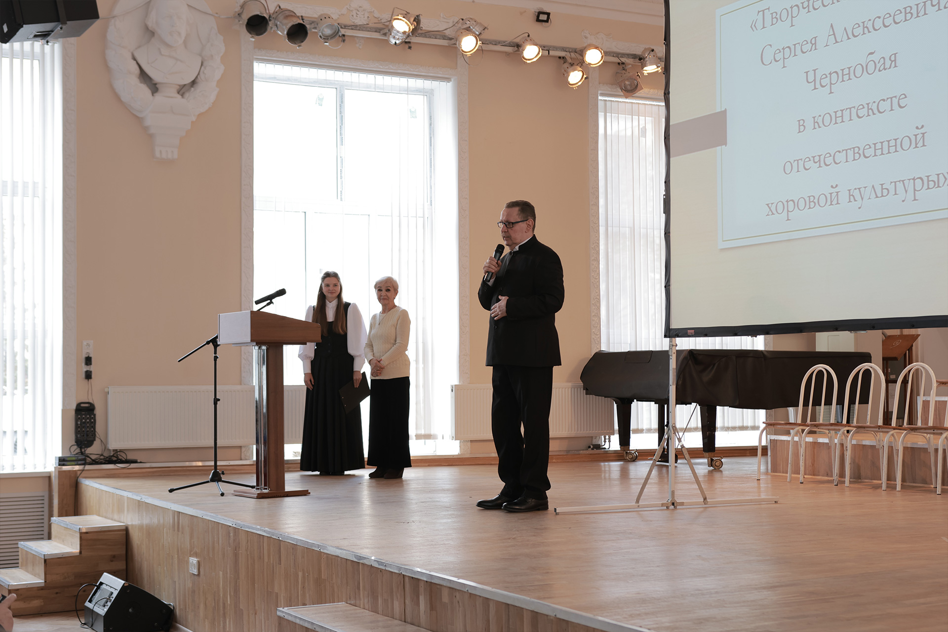 – Я помню, как здесь, на этой сцене старого здания музучилища, отец помог мне сделать запись репетиции оркестра для моего студенческого спектакля «Моцарт и Сальери», – рассказал сын хормейстера Алексей Сергеевич Чернобай, выпускник ГИТИСа, режиссёр, художественный руководитель Александровского театра драмы (г.Александров, Владимирская область). Он пожелал всем участникам конференции удачи в освоении профессии.