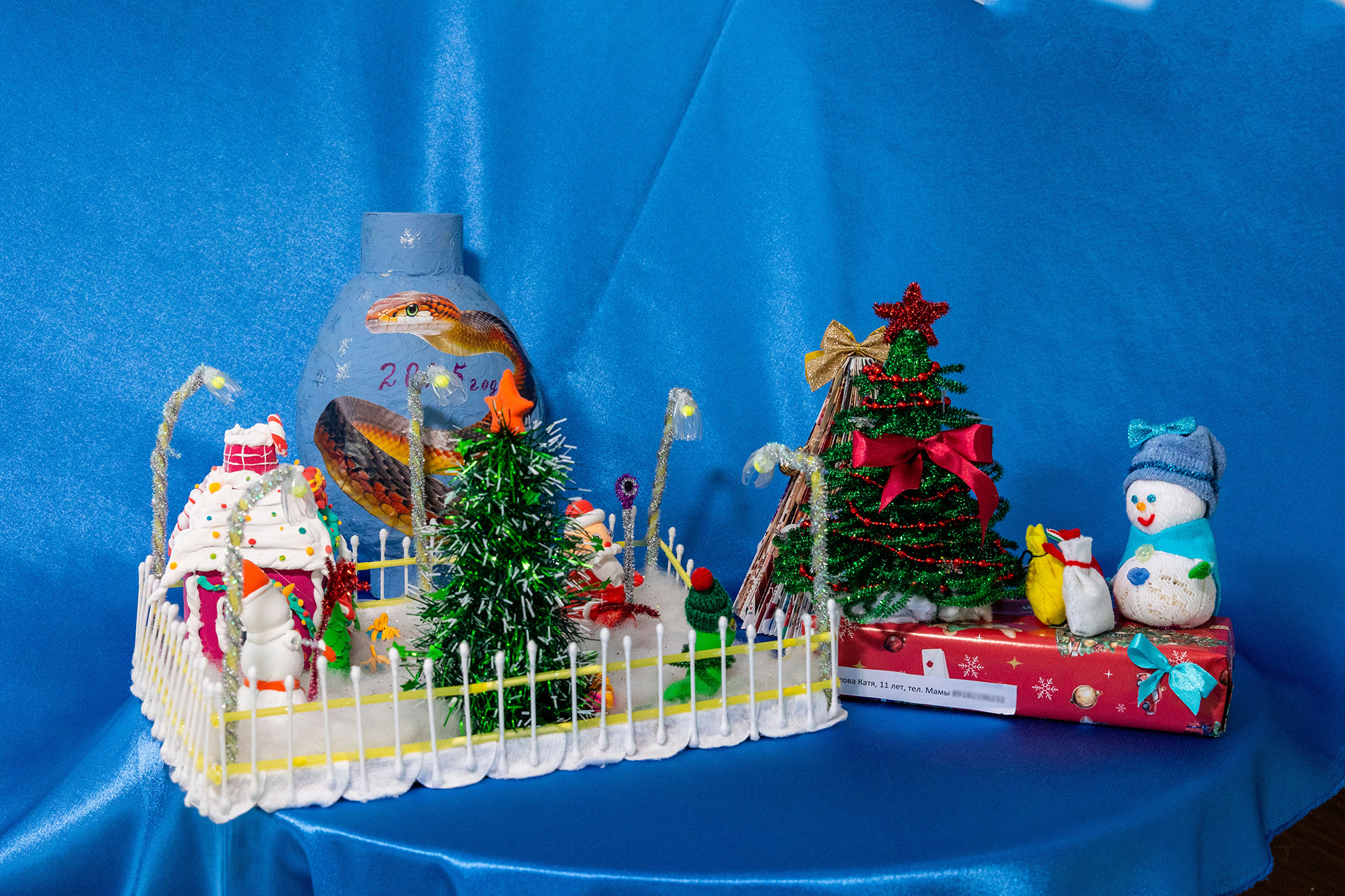 Сами же работы удивляют изобретательностью решений и смелостью дизайна. Здесь есть и чудо-печь из настоящего огнеупорного кирпича, и лесной домик из коры волшебного дерева, и экологическая ёлочка из втулок туалетной бумаги, и зимний букет с райскими птицами, и рвущиеся в полёт три белых коня… И символ восточного года – змея, исполненная в технике вышивки крестиком и в виде большой вазы из пресс-папье…