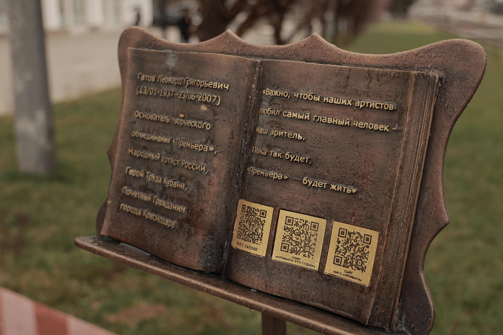 …Он стоит, опершись на кресло, напротив входа во Дворец искусств. Народный артист России, Герой труда Кубани, лауреат премии им. Ф. Волкова, почётный гражданин г. Краснодара. Свой, родной. Этот памятник успели полюбить дети, они с удовольствием позируют на его фоне. Старожилы «Премьеры» отмечают: с появлением на площади перед Дворцом искусств бронзовой фигуры Леонарда Гатова пространство преобразилось. Словно обрело смысл и законченность.