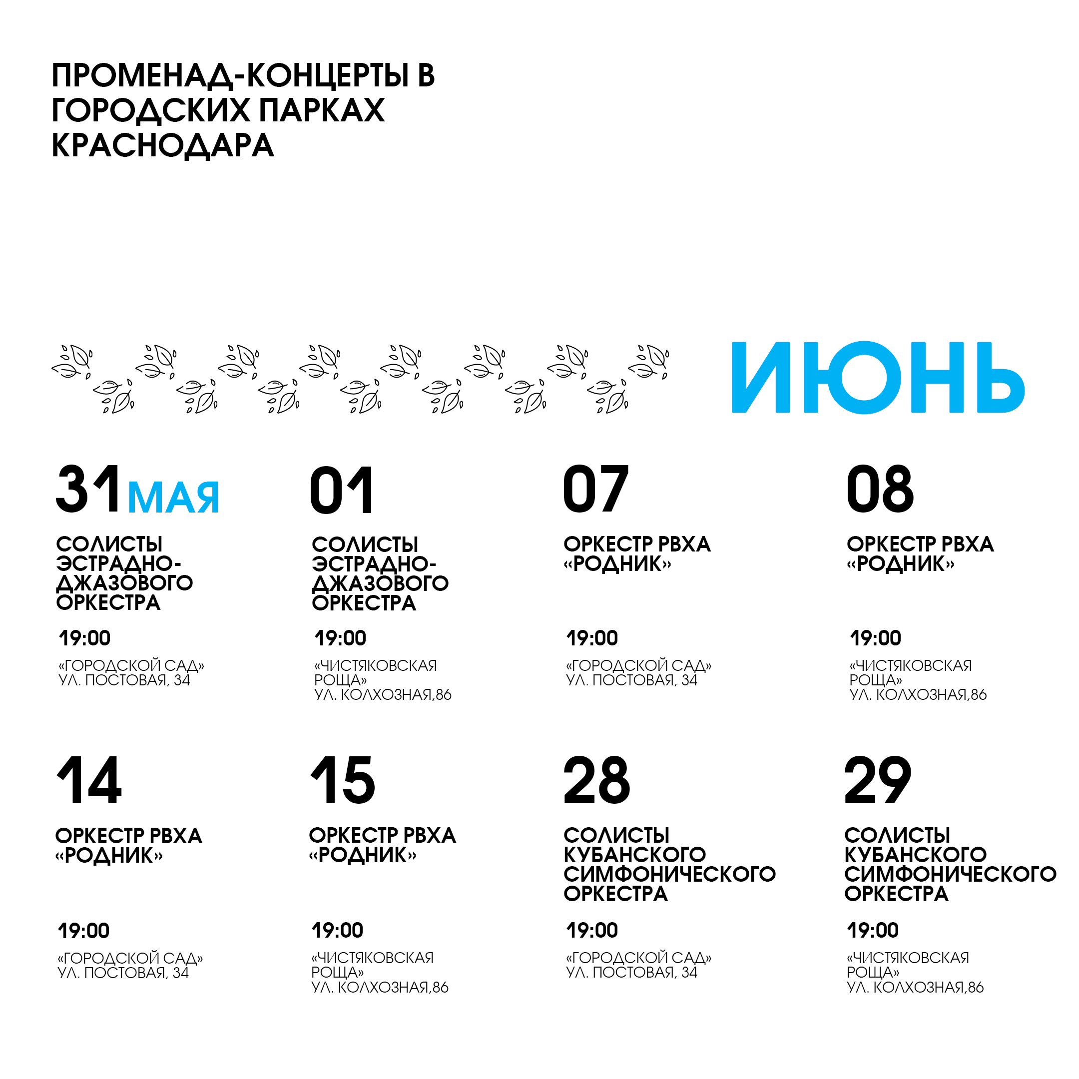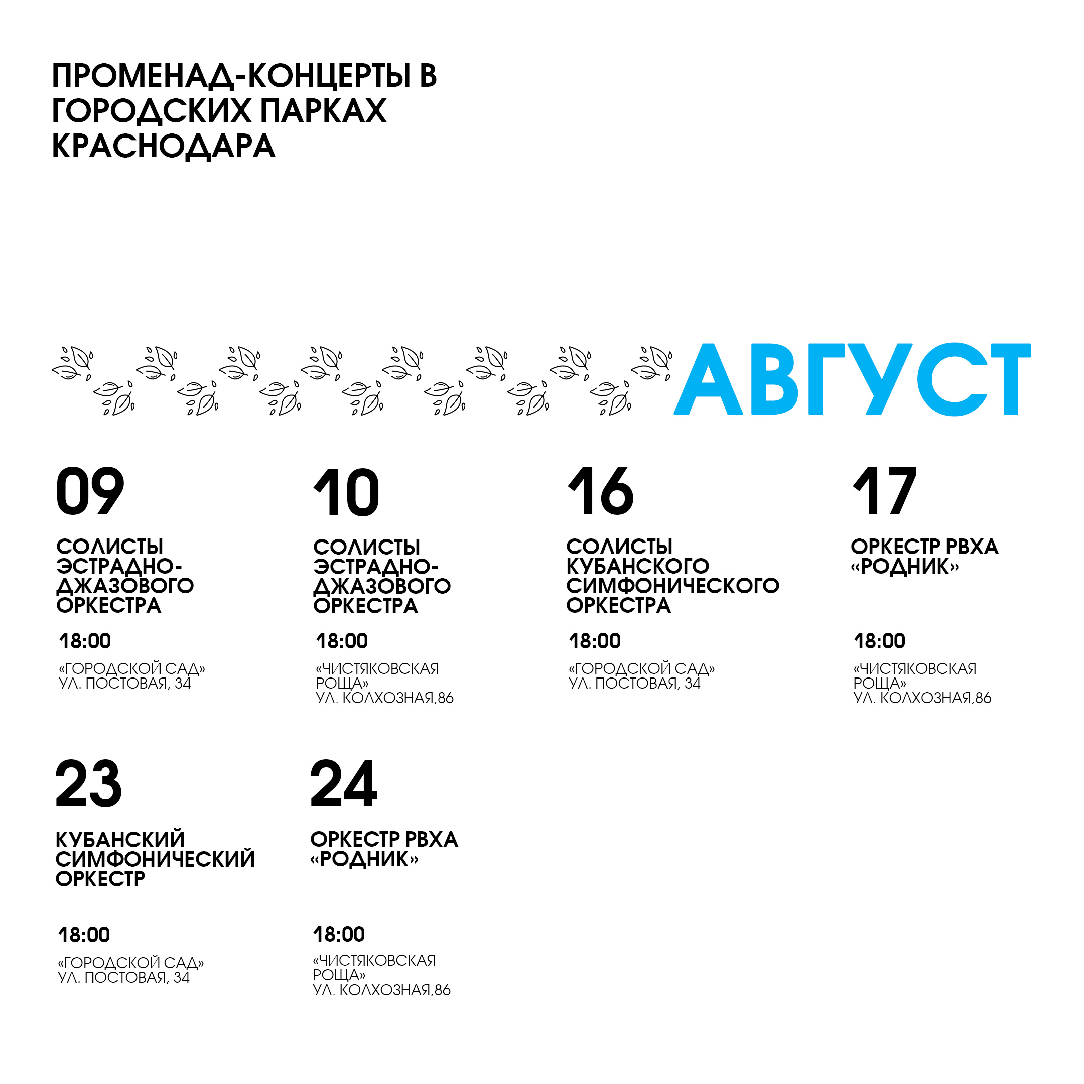 Этим летом для вас выступят: солисты эстрадно-джазового оркестра Ильи Филиппова, оркестр Русского вокально-хореографического ансамбля «Родник», Кубанский симфонический оркестр и его солисты.