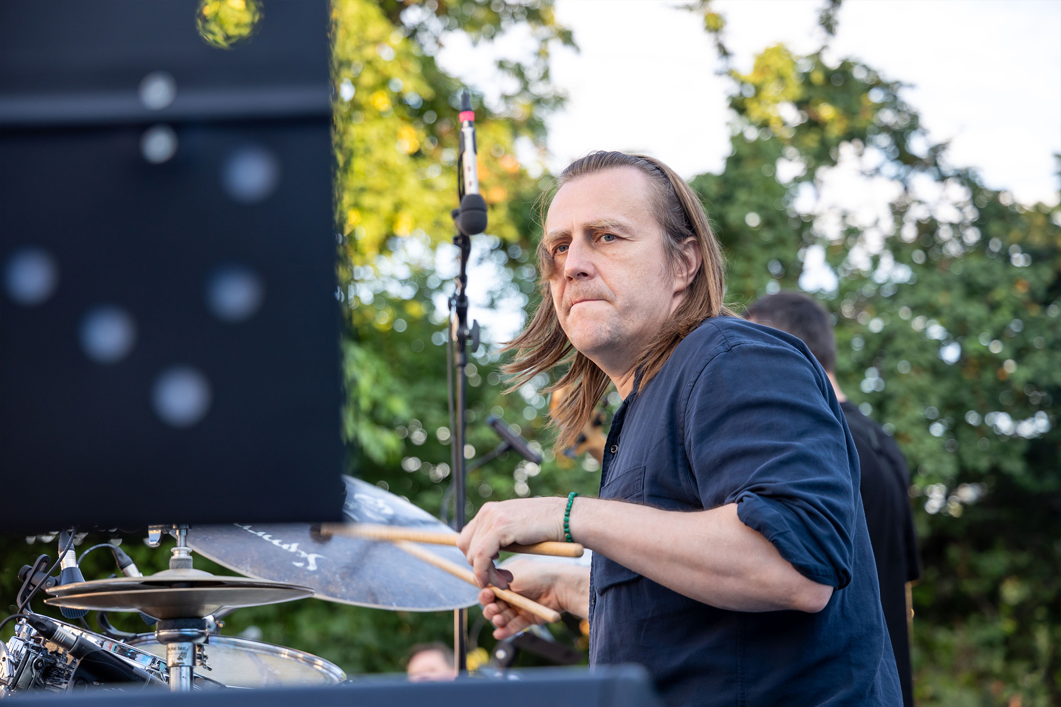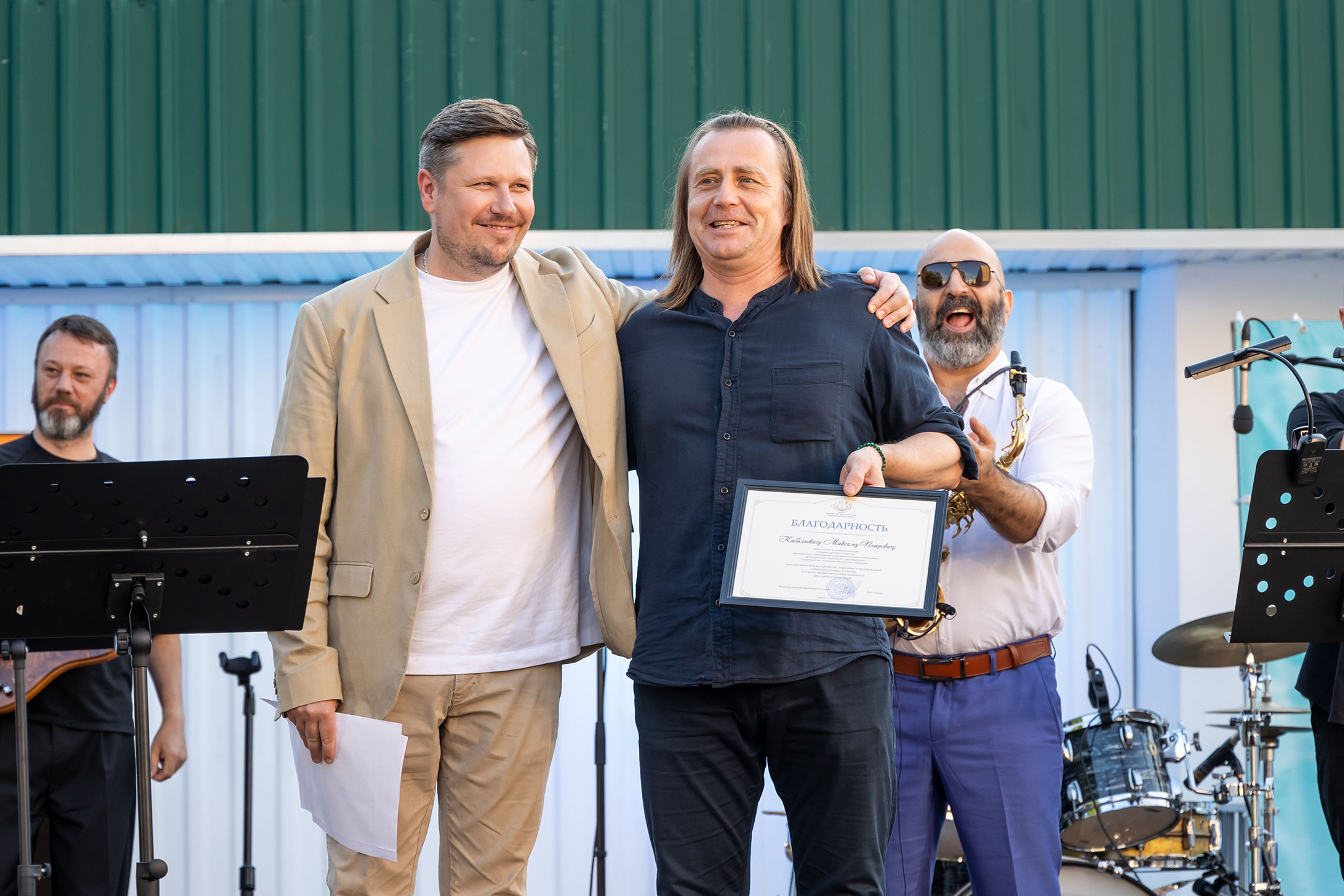 Вечер начался с приятной новости: барабанщика Максима Кабальскиса настигла благодарность министра культуры Краснодарского края Виктории Лапиной в честь Дня работника культуры. Реакция Максима Петровича, признанного гуру барабанных палочек, была предсказуема. Он ответил неистовым – ну, как он умеет – соло.